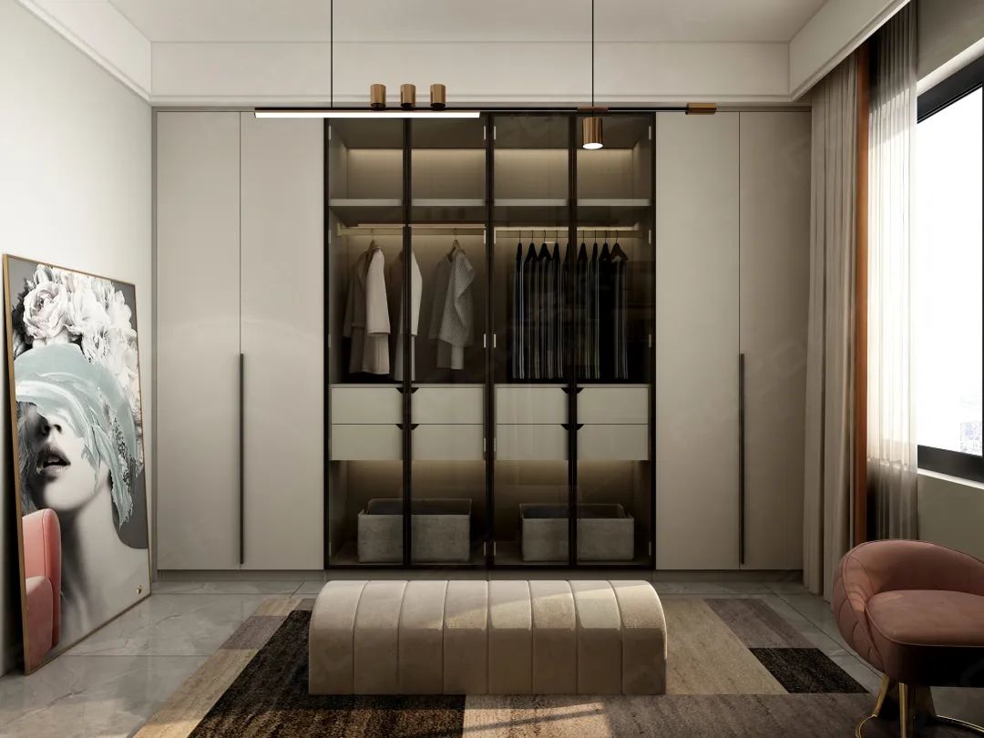 即使是临时做客也有足够的收纳空间,定制主卧同系列到顶式整墙衣柜,藏露结合,展示与收纳功能兼具。